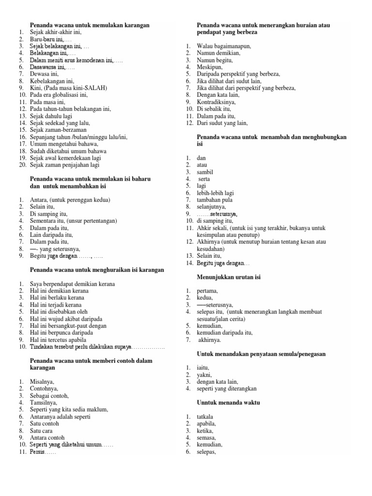 Gunakanlah penanda wacana yang saya sarankan di atas semasa menulis karangan supaya setiap isi mempunyai contoh 1. Suatu contoh untuk menguatkan suatu alasan boleh menjadi penanda wacana justifikasinyacontohnyasebagai tamsilan destruktif. Prasekolah - Kanak-kanak menerima pendidikan prasekolah sebelum masuk sekolah rendah.